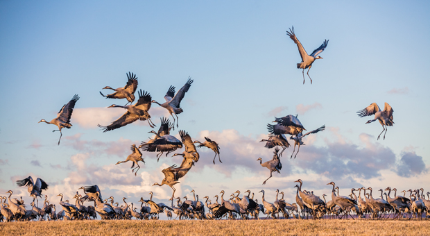 Vi börjar tidigt och tar oss ut till Hornborgasjön för att se när tranorna vaknar och går upp ifrån sjöns säkerhet för att äta. Att se och höra dessa tusentals fåglar är en mäktig upplevelse. Tag med kikare och kamera och upplev det på plats.